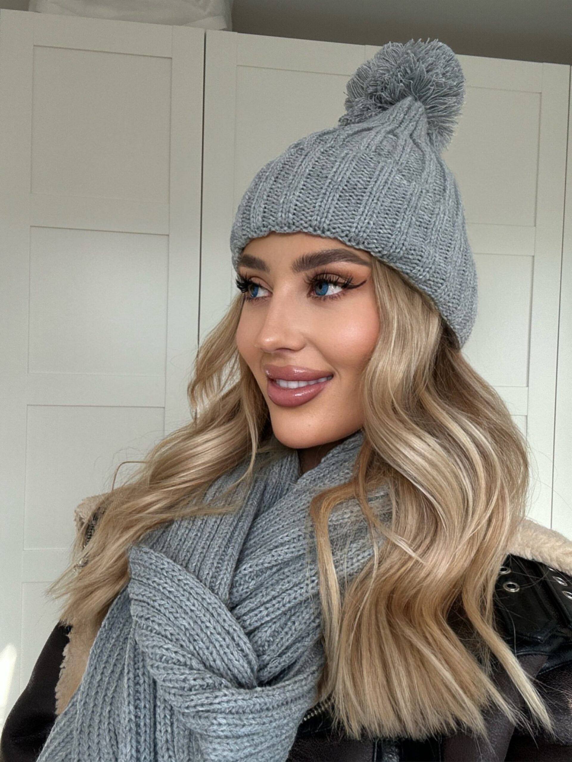Komplet Czapka z Pomponem i Szalik damski KIM Kolor SZARY